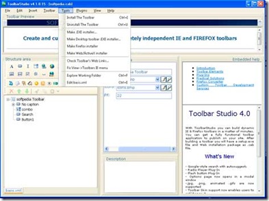 Toolbar Studio 4.1.0.46 Create and customize your own branded, completely independent IE and FireFox Toolbars in minutes with ToolbarStudio. Create a toolbar for your site which will help increase your revenues and repeat traffic. Now you can do this without spending thousands of dollars on programming. Intuitive “what you see is what you get” interface, free samples library.