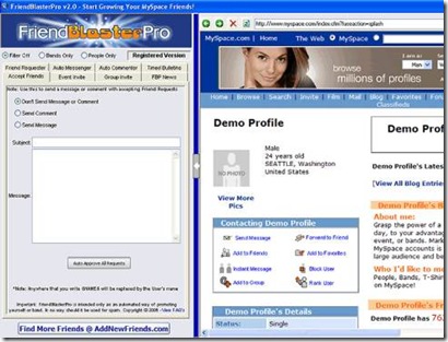 Friendblaster v10.1.5 FriendBlasterPro leverages the newest marketing medium for you. MySpace is a social network site where millions of people go to set up accounts about themselves and to interact with others. These members add each other as friends and take part in the many features MySpace has, creating an extremely large social network. Using this social network to market your products, services, events or bands is an extremely powerful new method of advertising. The process is very easy. You start by creating an account for your product on MySpace. You then send friend requests to other MySpace members, either targeting specific users or sending random invitations. Once you have your own network of friends who are interested in your product, you can send messages directly to them about product information, upcoming events, etc. As your list of friends grows, so does your profits. FriendBlasterPro features: -Target your market based on a members age, sex, geographic location, interests, and more. -Gather friend(s) id’s from browsing the groups, forums, friend lists, classifieds or any other area of MySpace. -Gather friend(s) id’s from Google! -Auto Messenger that allows you to send out messages to all of your friends or to any specified target market. -Send message along with Friend Request feature that allows you to send both a message and a Friend Request to the same person. -Auto Commenter feature that allows you to send out comments to all of your friends. -Option to remove all pending friend request (this feature is great when you start to have a large list of pending friend request!). -Create a “Black List” for ID’s you don’t want to send to. -Timed Bulletins feature that gives you full control of “how many” and “when” to send out Bulletins. -Accept Friends feature that allows you to accept all pending friend request and also allows you to send out a comment or message along with accepting your new friends. -Comes with a FriendBlasterPro News -Bulletin to keep you up to date with the latest news. -Free product updates Support and technical assistance. -Option for “Show my full name in this Friend Request” What’s new: -NEW! Captcha box focus when sending friend requests. -NEW! Added “Edit Log” button for event invites. -NEW! Fixed band filter, several other bugs, and gathering from search pages.